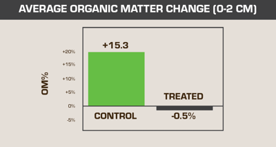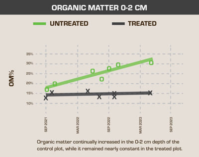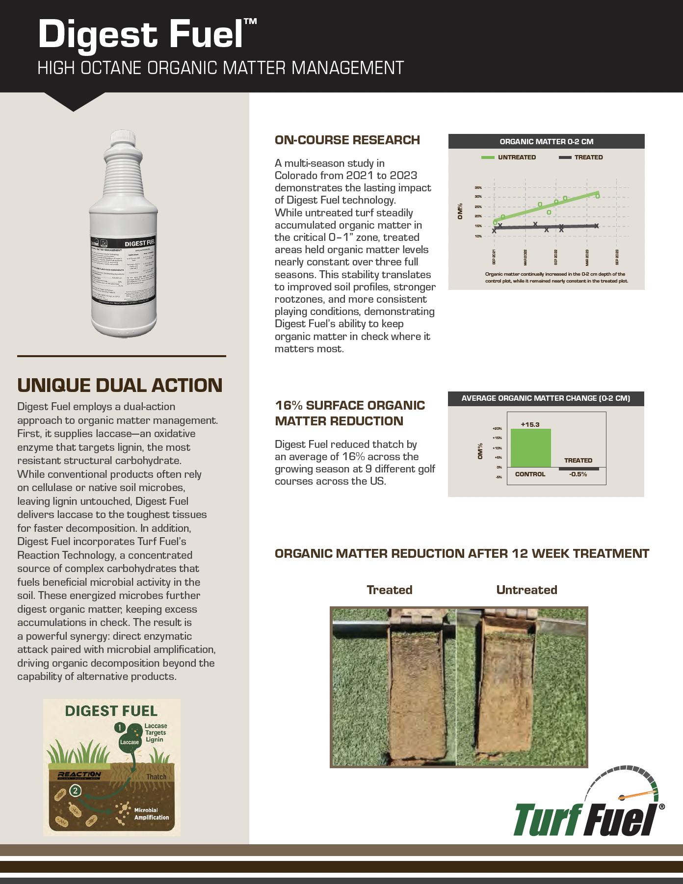 A multi-season study in Colorado from 2021 to 2023 demonstrates the lasting impact of Digest Fuel technology. While untreated turf steadily accumulated organic matter in the critical 0–1” zone, treated areas held organic matter levels nearly constant over three full seasons. This stability translates to improved soil profiles, stronger root zones, and more consistent playing conditions, demonstrating Digest Fuel’s ability to keep organic matter in check where it matters most.